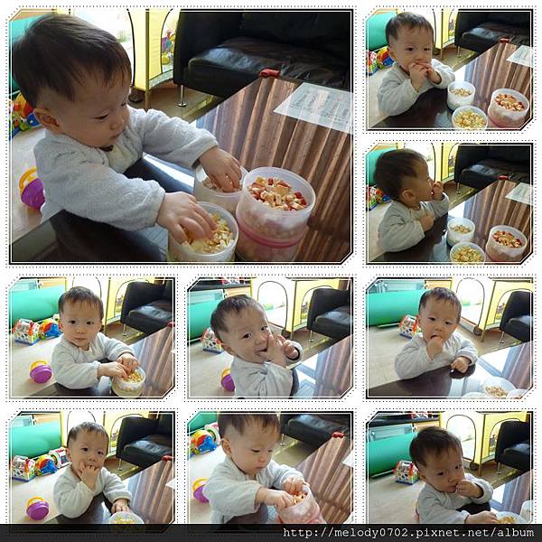 用餐之餘,讓姊弟倆自己用她們的小手拿取水果乾