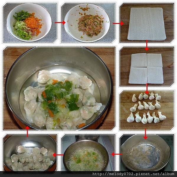 材料:餛飩皮、雞&豬絞肉各半、紅蘿蔔、小白菜、蔬菜湯、鹽少許、黑胡椒少許