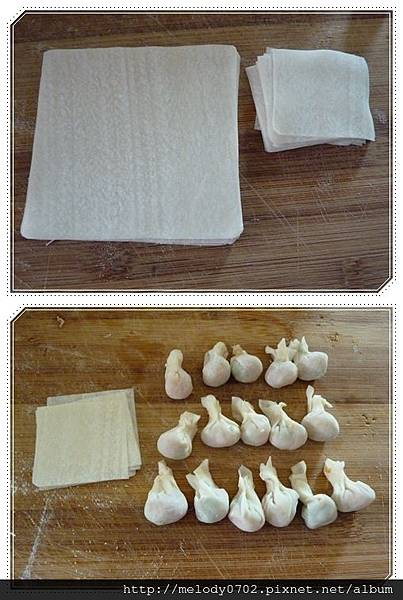步驟:大致如上圖,特別的是這次將餛飩皮均分成四等份,包成姊弟倆剛好一口的大小