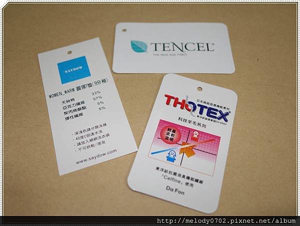 「SAYDOW 發熱衣」採用日本東洋紡T.H.O.TEX素材,具有吸濕發熱、保暖、抗菌除臭、伸縮性、不易變形、抗靜電等多種機能;主要成分有天絲棉33%、亞克力纖維57%、聚丙烯酸酯5%、彈性纖維5%,其中聚丙烯酸酯就是所謂的T.H.O.TEX素材,天絲棉(TENCEL)則源自於天然的纖維素纖維,是從經過森林標準委員會所認可管理的森林樹木中提取出來的,具有規則的納米級原纖結構,其高強度、高純淨度,能在濕態中依舊維持原有的化學性質,展現其優越的溼氣傳導功能。由於TENCEL纖維原料來自於天然,所以對於環境沒有什麼衝擊,所製成的產品是可被生物分解的,算是對愛護地球盡點微薄之力。