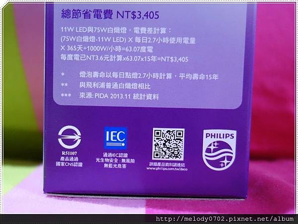 瞧瞧產品包裝上的統計數據得知,11W LED與75W白熾燈相比,以每日2.7小時使用電量來計算,就能節省63.07度電,以每度電3.6元計算,倘若使用15年的話,就能省下3405元。雖然LED燈泡較一般傳統燈泡價格偏高,但使用壽命比一般傳統燈泡長,相較於傳統燈泡還能節約85%能量,長久使用下來,當然還是LED燈泡最省最節能。