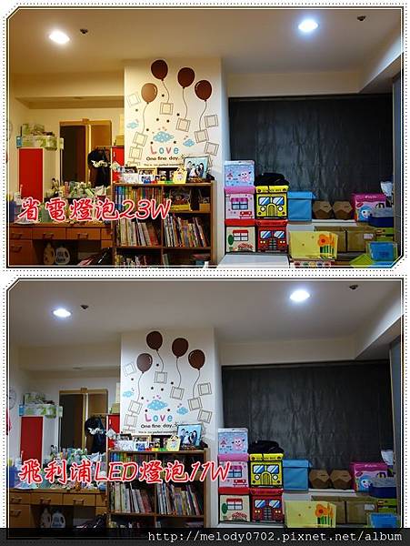 從此圖可明顯發現,在同一空間內僅改變照明光源就能影響空間的明暗度,左圖為使用傳統省電燈泡作為照明光源,右圖則改用飛利浦LED燈泡11W,改用LED燈泡後可明顯看出空間的明亮度大幅增加許多;過去其實不覺得書房空間照明不足,但安裝飛利浦LED燈泡11W後,的確發現書房空間亮度明顯增加,相較之下,原始書房內的亮度還真有點薄弱。