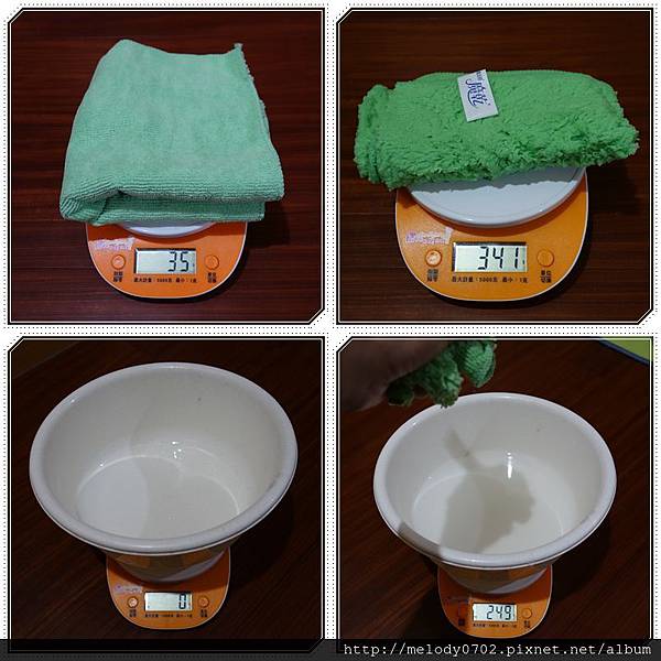 使用前,先來做個陽春版的小小試驗。前後測量乾、濕布的重量,弄濕的擦拭布以不滴水為原則再行測量,取一容器,將濕布擰乾,測量其吸水量。吸水性粗略計算方式為249/35=7倍之多,可見其長毛面吸水力十分驚人,是一般棉的兩倍以上。
