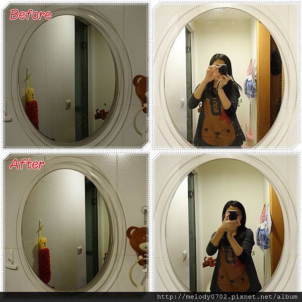 瞧瞧擦拭過後的鏡子,是不是已經找不到髒污的痕跡,仔細比對一下,清潔前後的差異度到底有多大。