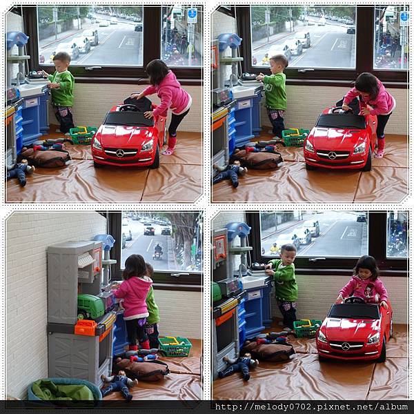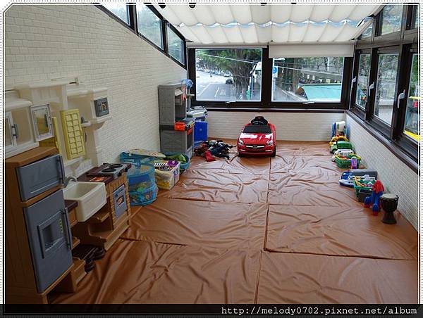 享用餐點後,我才放鳥出籠,讓姊弟倆盡情在遊戲間玩樂,不知嘉嘉是不是第一次到訪,居然對這台紅色車子頗有興趣,讓我想到台中 城堡樂園時的有趣景象。當然這個興趣只是曇花一現,她最愛的還是扮家家(嘉嘉)酒,呵呵~