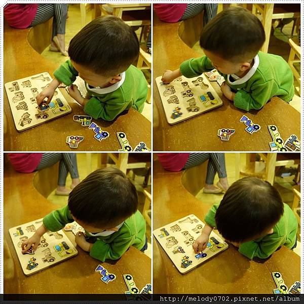 喜愛車子的叡叡接手後,一個接著一個比對後排列放置,不一會兒就完成全圖,還能一一道出交通工具的名稱,不愧是車子的忠實粉絲。