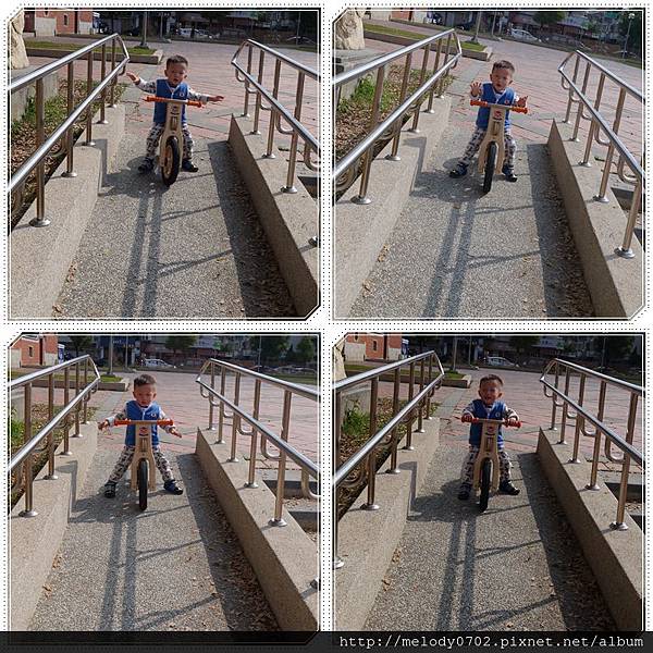 不過遇到向下斜坡,叡叡的表情似乎有些許變化,縱使兩腳日前已經敲敲離地,下坡路段似乎尚未克服,加油囉!指日可待~相信有天就能馳騁於兒童界的滑步車跑道中。