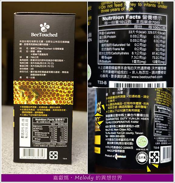 台灣農場出品,通過ISO 22000及HACCP國際認證,也榮獲國際性認證標章「伊斯蘭HALAL認證」,是優質產品的象徵,是深受我信賴的台灣蜂蜜。
