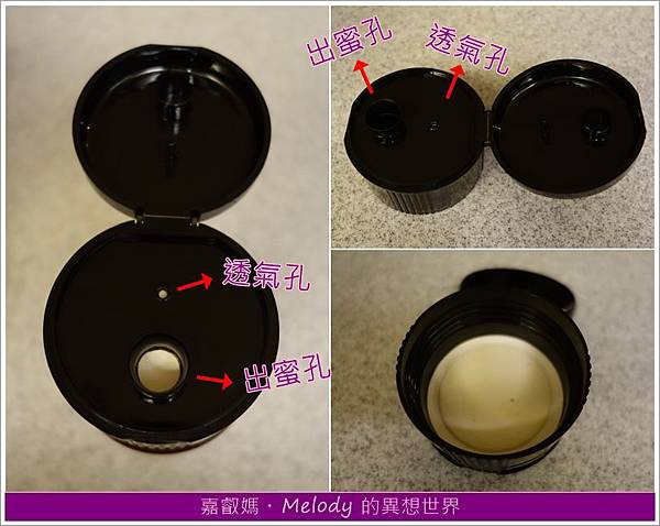 初次開封,先將黑色瓶蓋旋轉開啟,取出白色封膜後再使用。大小孔設計,傾倒瓶身就能輕鬆倒出蜂巢蜜,一點兒也不費力。