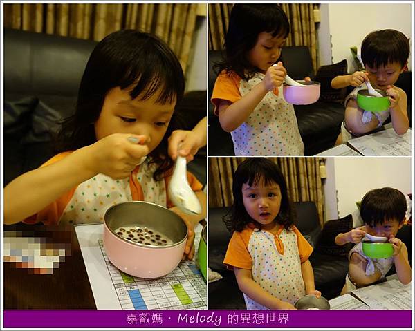 瞧瞧兩姊弟幸福滿溢的滿足表情,不枉費我大熱天還親自烹煮他們愛吃的粉圓。