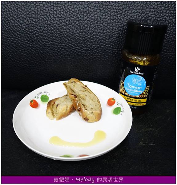 利用麵包機自製的吐司,沒啥味道,切片後沾上些許「蜜蜂工坊BeeTouched 台灣蜂巢蜜」,嚐起來味道香甜,口感更有層次,替平淡無奇的吐司增添香濃滑順的口感,真是美味極了。