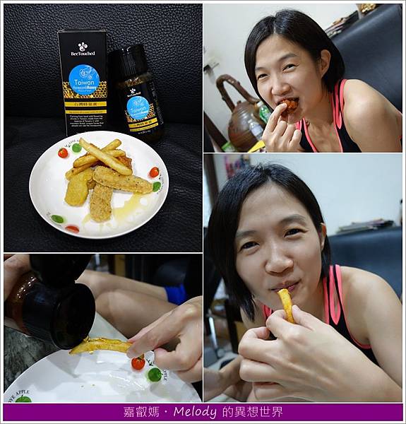 某日午間,來份炸物四寶,我一向不愛醬料,有了前幾次的美味經驗後,此次嘗試讓炸物沾取些許「蜜蜂工坊BeeTouched 台灣蜂巢蜜」,意外發現兩者的結合居然是如此match,其中的薯條加上蜂巢蜜,嚐起來有種類似蜜番薯的口感,這可是挑嘴的小妹首先發表的心得,引誘我品嚐一口,果真濕潤、微甜、好順口,平日不愛沾醬的我也嘖嘖稱奇,這實在是太美味了~