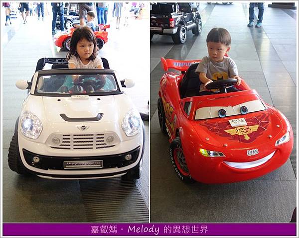 午飯後,提早到場集合,Bryan載著兩姊弟先行抵達集合地點,而我開車載著紙箱裝扮隨後抵達,沒多久就看見兩姊弟各開著一台電動汽車趴趴走(大人操控)。是怎樣!還沒要糖就先撒錢來滿足孩子的要求,這~可不是我想給孩子體驗的活動之一,雖然當下心裡有點不是滋味,還是隨手拍了幾張,瞧瞧兩姊弟實際體驗後,也沒多開心,尤其Janet上路沒多久就想跳車不玩,我想他們目前較喜歡能自己操控的玩具。(我可不想用無止盡的金錢或物質享受來滿足孩子的予取予求,是我想太多了嗎?)