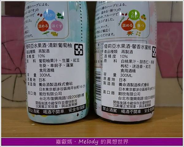 來自日本的藥酒大廠 - 養命酒製造株式會社,創新研發出結合東方草本配方的水果酒,目前已有多種口味在台上市,非常適合愛嚐鮮的朋友們,這次我要介紹的「優莉亞水果酒」有兩種口味,分別是「清新葡萄柚」與「馨香水蜜桃」。光看瓶身就讓我心花怒放,包裝設計非常精緻,玻璃瓶身,低調中帶點奢華感,隱約可見多種原料和香草圖樣。