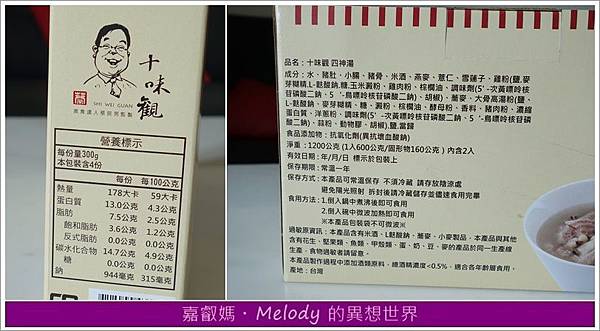 說到四神湯這道傳統藥膳,關於它的功效請搜尋網路資料就可得知,雖然平常自己不會烹煮,偶爾也會在自家附近的藥膳小吃店欽點這一道。此次收到的盒裝,內有兩包,一包約600g,外盒及內包裝皆有標示有效日期,光看外包裝的四神湯照片,就讓我口水直流,差點拿手來接。