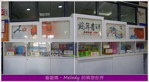 服務台後方玻璃櫥窗內陳列著可兌換的獎勵品以及各年級的教材。