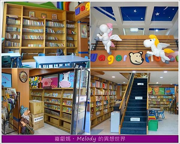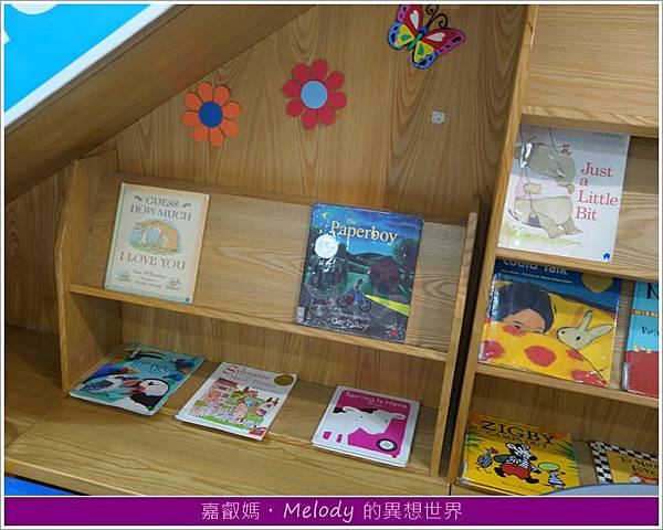 趁著空檔,Melody稍微看了館內圖書館的佈置,意外發現校方真是貼心,故事書的陳列方式似乎是依年齡層來區分,像是適合幼幼班的繪本就擺放在較低的書架上。