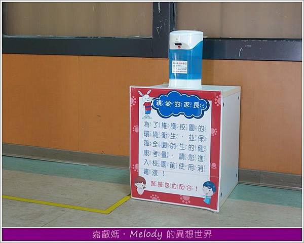 穿越大廳,走進校內,第一眼就看見消毒措施,孩子們入校後會先測量額溫並做手部清潔,午睡醒來以及下課前則測量耳溫,倘若超過38℃會先帶到保健室隔離,並通知家長協助處理。