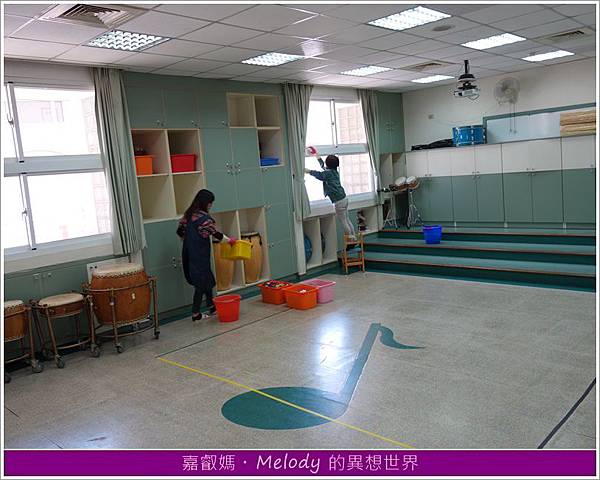校內平時有專門的清潔阿姨在打掃,課後的教室則由老師們個別清理,上圖就是清潔阿姨正在清理Music Room。