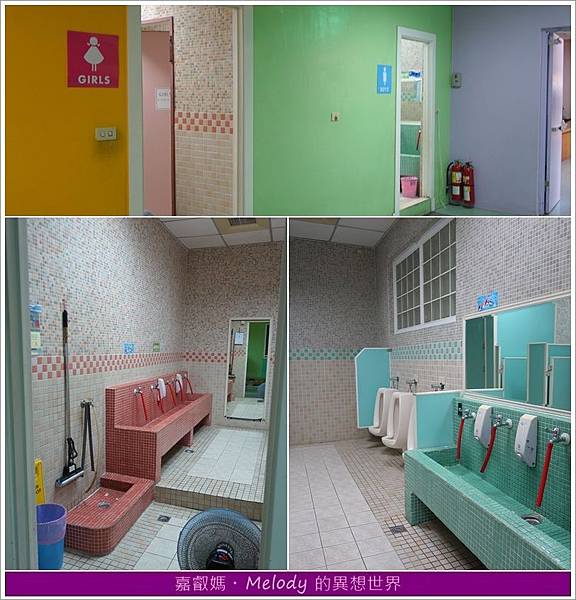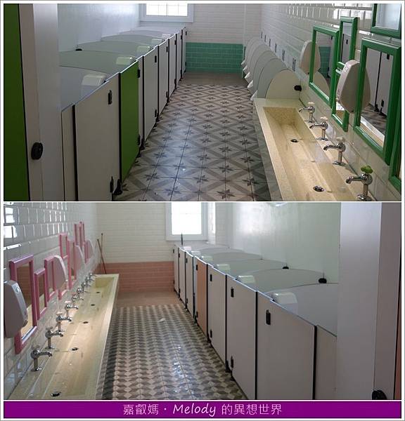 走廊的盡頭則是幼童專用的廁所,從牆面、磚塊的顏色以及男女有別的圖文招牌就可看出男女佈置大不同,此外,便器的型式、洗手檯的高度以及數量都是經過巧妙安排而設計的。
