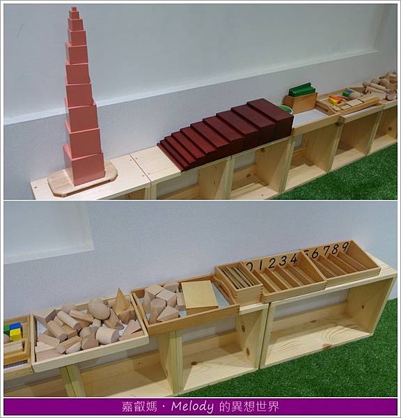 還有各類木製教具,像是疊高高、階梯式教具、形狀積木以及數學配對木棒等。