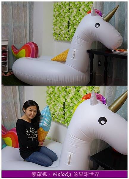 前方擺放一座超大型的獨角獸氣墊床,好適合放在海上漂浮,或者陳列在家中辦party用,Melody玩心大開,經店家同意便跳上去裝模作樣拍張照紀念。
