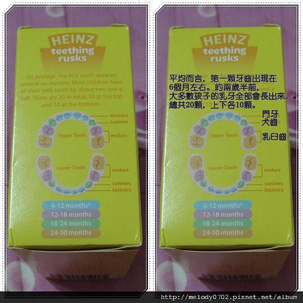 英文版的寶寶乳牙生長發育相關介紹,右圖為中文翻譯